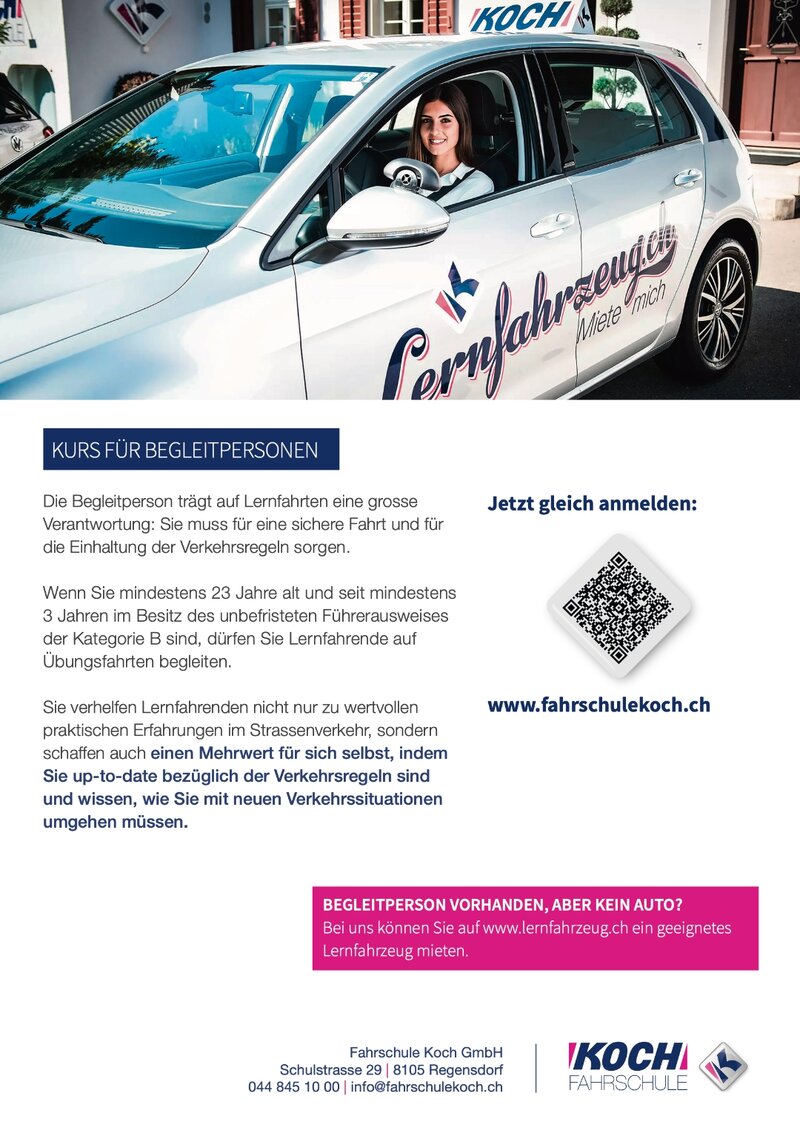 Wir haben einen äusserst interessanten Kurs für Begleitpersonen entwickelt. Er spricht vor allem Personen an, die gerade Fahranfänger privat ausbilden und ihre Kompetenz auf den neusten Stand bringen wollen. Anmelden kannst Du Dich unter www.fahrschulekoch.ch oder per Mail: info@fahrschulekoch.ch und Telefon 044 845 10 00.